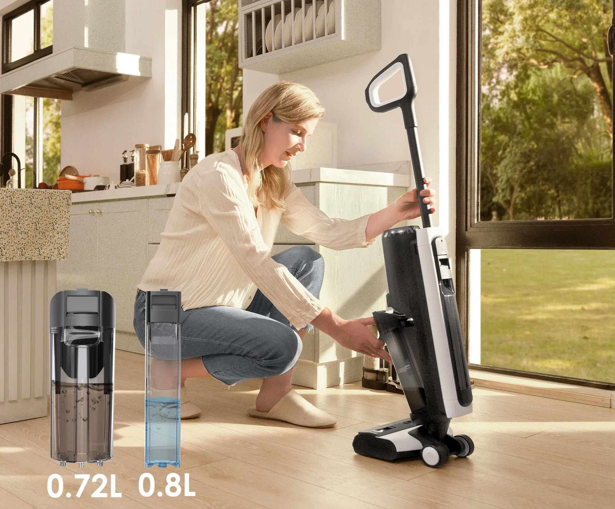 Conçu pour le nettoyage humide et sec, il aspire et lave simultanément vos sols durs, éliminant la poussière, les éclaboussures et les saletés collantes en un seul mouvement fluide.